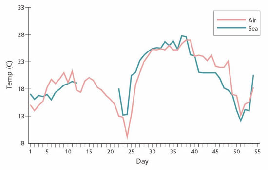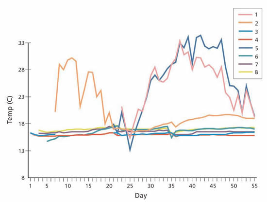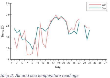Buque 2. Plano y alzado que muestra la ubicación de los sensores en las bodegas. Se embarcó maíz en Rosario a fines de junio/primeras semana de julio de 1965 y los sensores fueron colocados en las bodegas 2 y 5. Cada bodega con tres sensores enterrados en la parte inferior de la bodega y un cuarto sensor fue colocado en la superficie de la carga en la zona de la escotilla del entrepuente, cuya ubicación aproximada se puede ver en el diagrama. Carga en general fue embarcada en el entrepuente de cada bodega. Cada vez que se instalaba un sensor en la carga se tomaba una muestra del producto adyacente que era sellada y analizada para obtener el contenido absoluto de humedad. Los resultados nuevamente variaban entre 12.8% y 14.5%. Las temperaturas de las muestras, las cuales oscilaban entre 19°C y 22°C, estuvieron por encima, en cada instancia, de la temperatura del aire del ambiente en el día en el que se embarcó la carga. No se esperaba deterioro biológico con estas cifras, salvo que la travesía fuera prolongada. Durante la travesía, del 6 de julio al 25 de julio, el sistema de ventilación Cargocaire estuvo operando continuamente sin problemas a excepción de un periodo breve en Santos el 9 y 10 de julio, cuando se hizo circular aire pre-secado en las bodegas. Cada día se registraba la temperatura del agua de río/mar y la temperatura del aire del ambiente, las cuales están trazadas en los gráficos, pero debido a que aparentemente el equipo solo se utilizó intermitentemente durante la descarga, esta fecha ha sido omitida del periodo posterior al 29 de julio. Los gráficos también muestran la temperatura máxima registrada diariamente por cada sensor. Desafortunadamente, unos estibadores robaron el sensor 5 antes de que se pudiera obtener lecturas. Los estibadores malograron los sensores 1, 2, 3 y 4 durante las operaciones de descarga en Marsella y no se pudo obtener lecturas de fechas posteriores al 28 de julio hasta que se llevaron a cabo reparaciones temporales el 2 de agosto y el 4 de agosto.