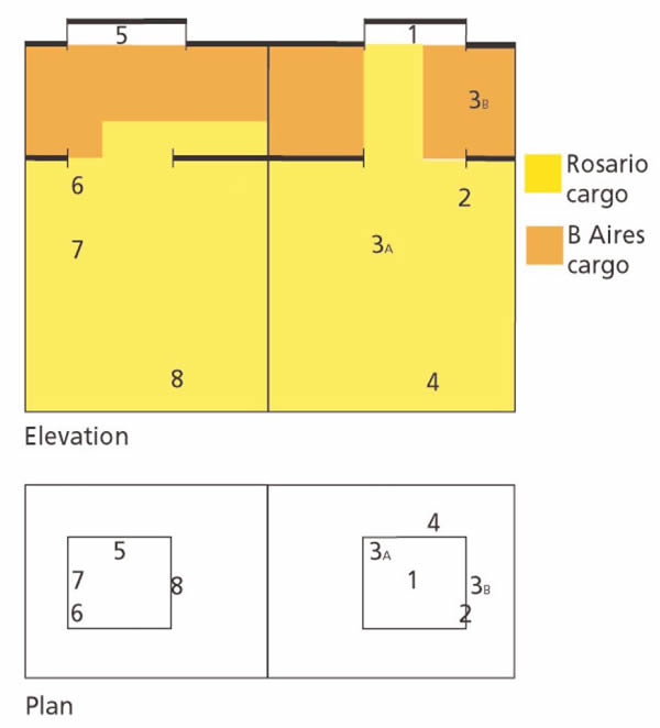 Lo ideal, por supuesto, sería encontrar focos de daño por calentamiento de igual tamaño e intensidad en cargas del mismo producto en dos bodegas distintas en el mismo buque, y ventilar una y no la otra, y en base a esto demostrar si un proceso de ventilación tendría algún efecto. Dicho experimento es completamente impráctico y probablemente nunca podría ser llevado a cabo. Sin embargo, si ventilar la superficie de la carga logra algún efecto con respecto al calentamiento dentro del granel, uno tiene que asumir que el aire de ventilación tendrá un efecto de enfriamiento en el producto dentro del granel del maíz. Si este fuera el caso, de igual manera será que el aire de ventilación afectaría la temperatura del maíz dentro del granel haya habido calentamiento o no. Por consiguiente, se decidió examinar los cambios de temperatura dentro cargamentos de maíz a granel durante embarques de Sudamérica a Europa. En total, se equipó cuatro buques con mecanismos capaces de registrar hora por hora las temperaturas registradas por hasta ocho termómetros (sensores de termistor) enterrados en distintos lugares en el cargamento de maíz dentro de las bodegas del buque. Desafortunadamente, el experimento en dos de los buques fue abortado. En los otros dos buques, se pudo llevar a cabo el experimento tal y como fue planeado. Buque 1 Este fue el buque Liberty que embarcó maíz en Rosario y Buenos Aires en junio y en la primera semana de julio de 1965. Los termómetros fueron colocados en la carga estibada en las bodegas 2 y 3. Se enterró tres sensores en la carga de cada bodega; y un cuarto sensor se colocó en la superficie de la carga debajo de las tablas de escotilla de la cubierta superior. El diagrama muestra la ubicación aproximada de los sensores. El sensor 3A en la bodega inferior número 2 dejó de funcionar el 18 de junio y fue reemplazado en Buenos Aires con el sensor 3B en el entre puente número 2 el 2 de julio.