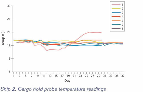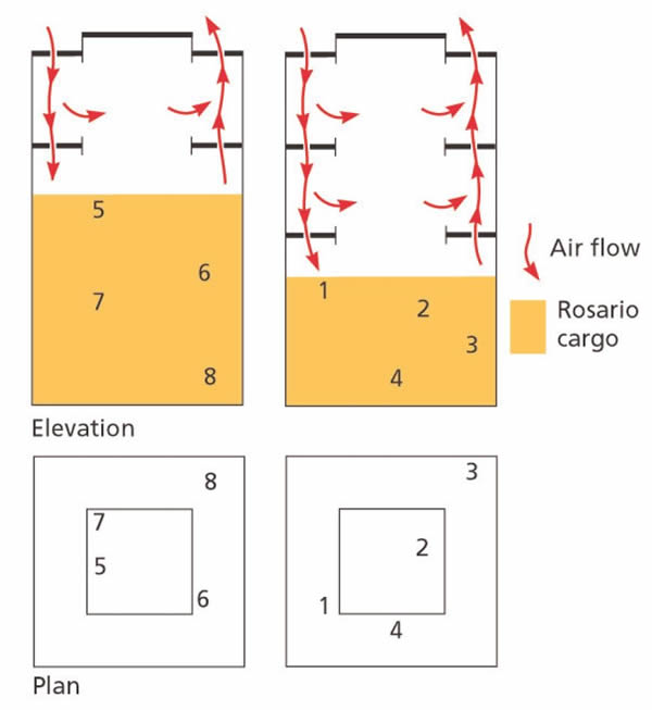 Buque 1. Plano y alzado que muestra la ubicación de los sensores en las bodegas. Cada vez que se instalaba un sensor en la carga, se tomaba una muestra del producto adyacente que era sellada y analizada para obtener el contenido absoluto de humedad. Los resultados variaban entre 12.8% y 14.5%. Las temperaturas de las muestras, las cuales oscilaban entre 15°C y 20°C demostraron que la carga, en general, tenía más temperatura que el aire del ambiente el día en el que se embarcó. No se esperaba descomposición microbiológica con estas cifras. A fin de mantener al mínimo el espacio libre entre la superficie de la carga y la cabecera de cubierta, la carga fue trimada entre los baos de cubierta y las brazolas de escotilla. Antes de zarpar, se retiraron los hongos de ventilación y se taparon los ductos. El cargamento no recibió ninguna clase de ventilación durante los 31 días que duró la travesía. Los gráficos muestran, en primer lugar, la temperatura máxima registrada por día por cada sensor y, en segundo lugar, la temperatura del aire en el ambiente y la temperatura del agua de río/mar registrados por los buques (no hubo registros del agua de río/mar entre el 23 de junio y 2 de julio debido a que el termómetro del buque estaba dañado). Aparte de los sensores 1 y 5 que al estar situados en la superficie de la carga, cerca a la cubierta superior, tenían la tendencia a seguir las temperaturas de ambiente, cinco de los seis sensores restantes no mostraron variaciones de temperatura que estuvieran por encima de los 2.7°C a lo largo de los 69 días en los que el buque transportó la carga. El otro sensor, el número 2, fluctuaba según el aire en el ambiente hasta que se embarcó carga en el entrepuente número 2 en Buenos Aires. Al parecer esto indica que, antes de ese momento, el sensor 2 se encontraba sobre, o muy cerca a la superficie de la carga de Rosario. El maíz fue descargado en buenas condiciones. Las muestras tomadas de producto ubicado alrededor de cada sensor no mostraron ninguna evidencia de deterioro. Buque 2 Este fue un buque carguero construido en Yugoslavia en 1961, el cual había sido equipado con el sistema de ventilación Cargocaire. Este era uno de los sistemas más sofisticados de ventilación de aire disponible. Fue diseñado para permitir la ventilación continua de la carga en todas las bodegas, sin tener en cuenta el punto de rocío del aire (exterior). Cada espacio de carga estaba equipado con ductos de ingreso y salida, justo por debajo del nivel de la cabecera de cubierta. De este modo, por ejemplo en la bodega 2, había tres pares de ductos, en la bodega inferior, en el entrepuente inferior y en el entrepuente superior. Los ductos desembocaban en un ducto principal común en cada bodega; el ducto principal de salida equipado con un ventilador de aspiración y un elemento sensorial de punto de rocío. El elemento sensorial de punto de rocío estaba conectado a una grabadora ubicada en el puente. Este instrumento grababa el punto de rocío de la atmósfera que pasaba por el ducto principal. Durante operaciones normales, el aire exterior era continuamente succionado a través de ventiladores de ingreso y vaciado a través de ventiladores de salida. El punto de rocío del aire en el ambiente también era registrado por un instrumento ubicado en el puente. Si el punto de rocío del aire entrante hubiera sido mayor que el punto de rocío de la atmósfera proveniente de cualquiera de las bodegas, entonces la condensación podría haberse producido. De ahí que cuando predominó dicha situación, se forzó aire pre-secado dentro de la bodega, se cerró el ducto de salida y se hizo recircular el aire inyectado. Cargocaire tiene las siguientes ventajas por encima de una ventilación común:
